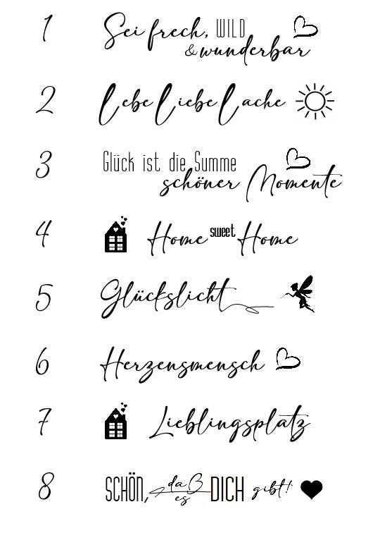 Sei frech…, Lebe…, Glück…, Home…, Glückslicht…, Herzensmensch…, Lieblingsplatz…, Schön, daß…