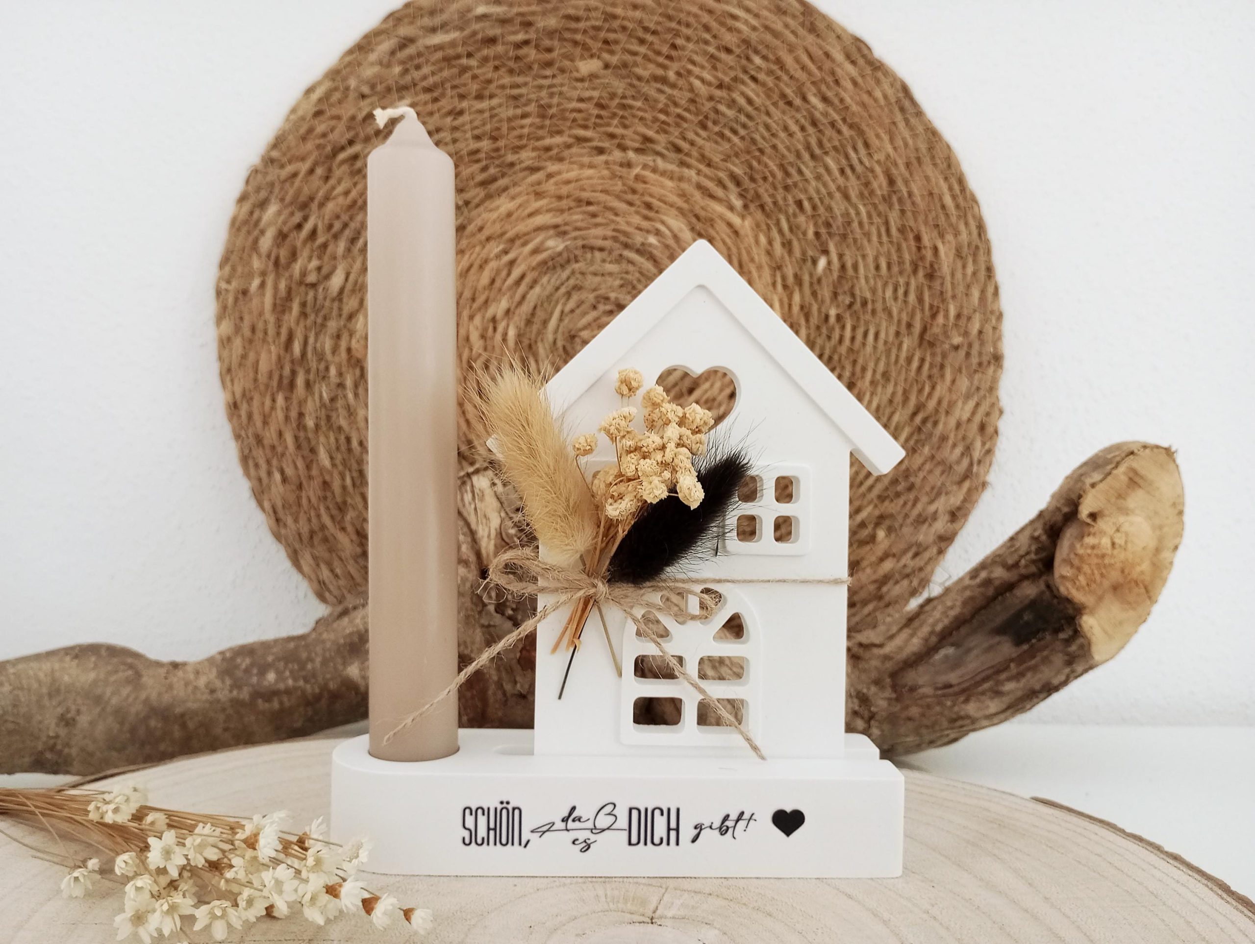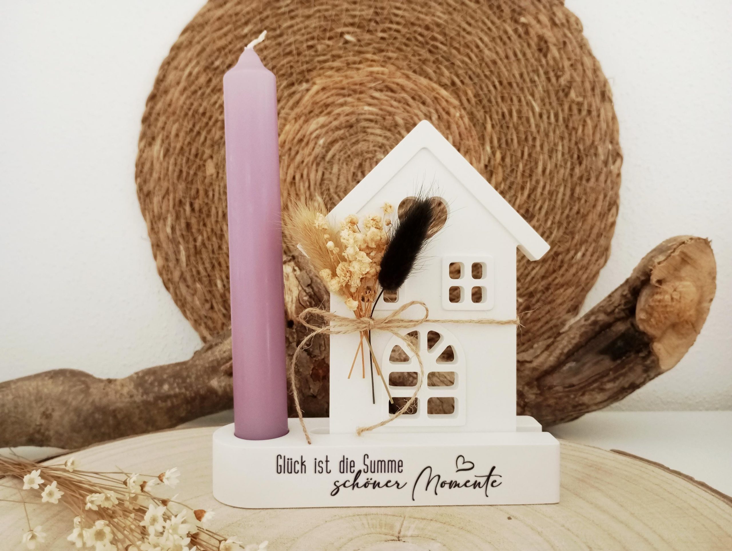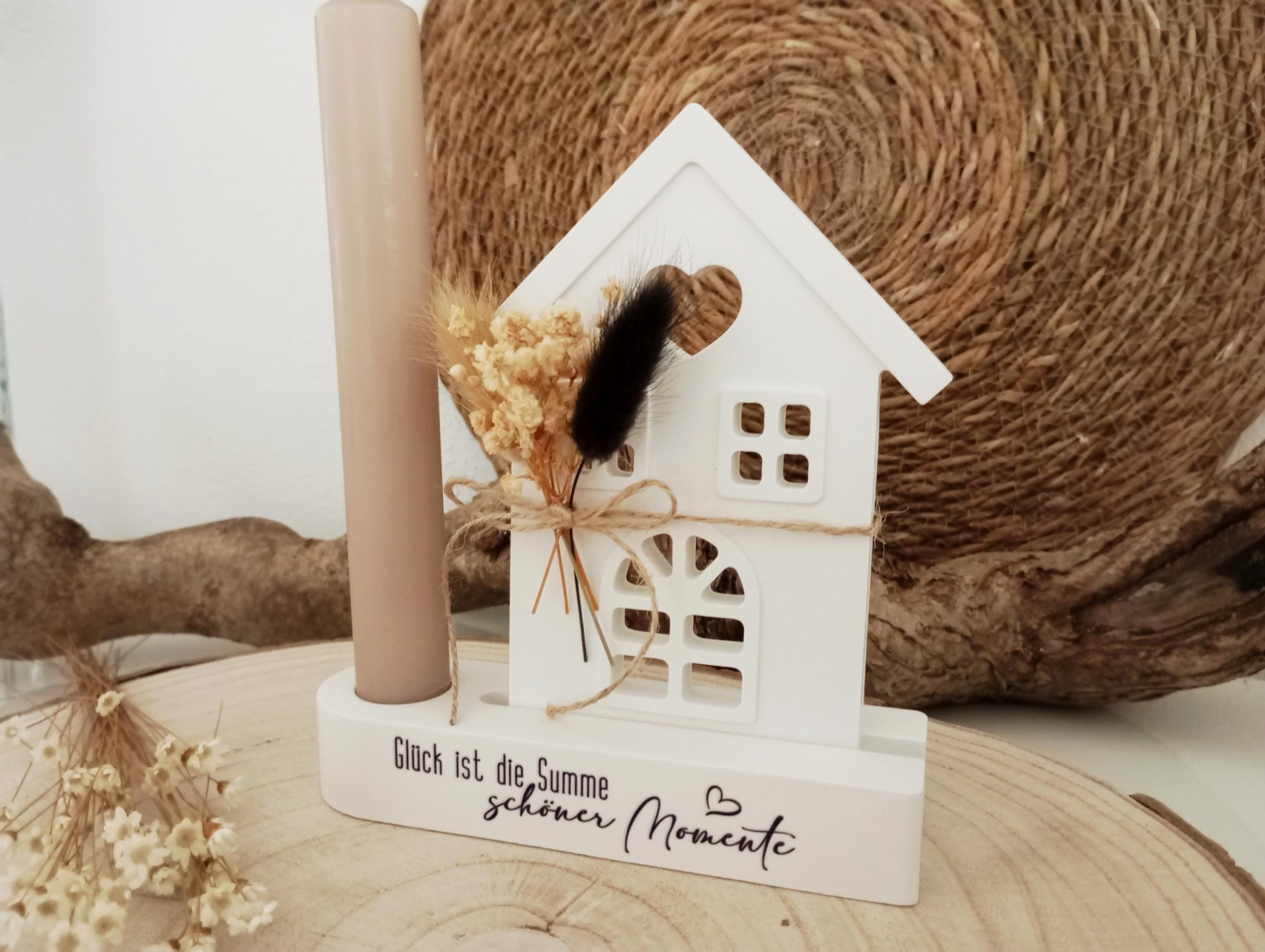 Handgefertigtes Haus mit Kerzenständer und liebevollem Spruch