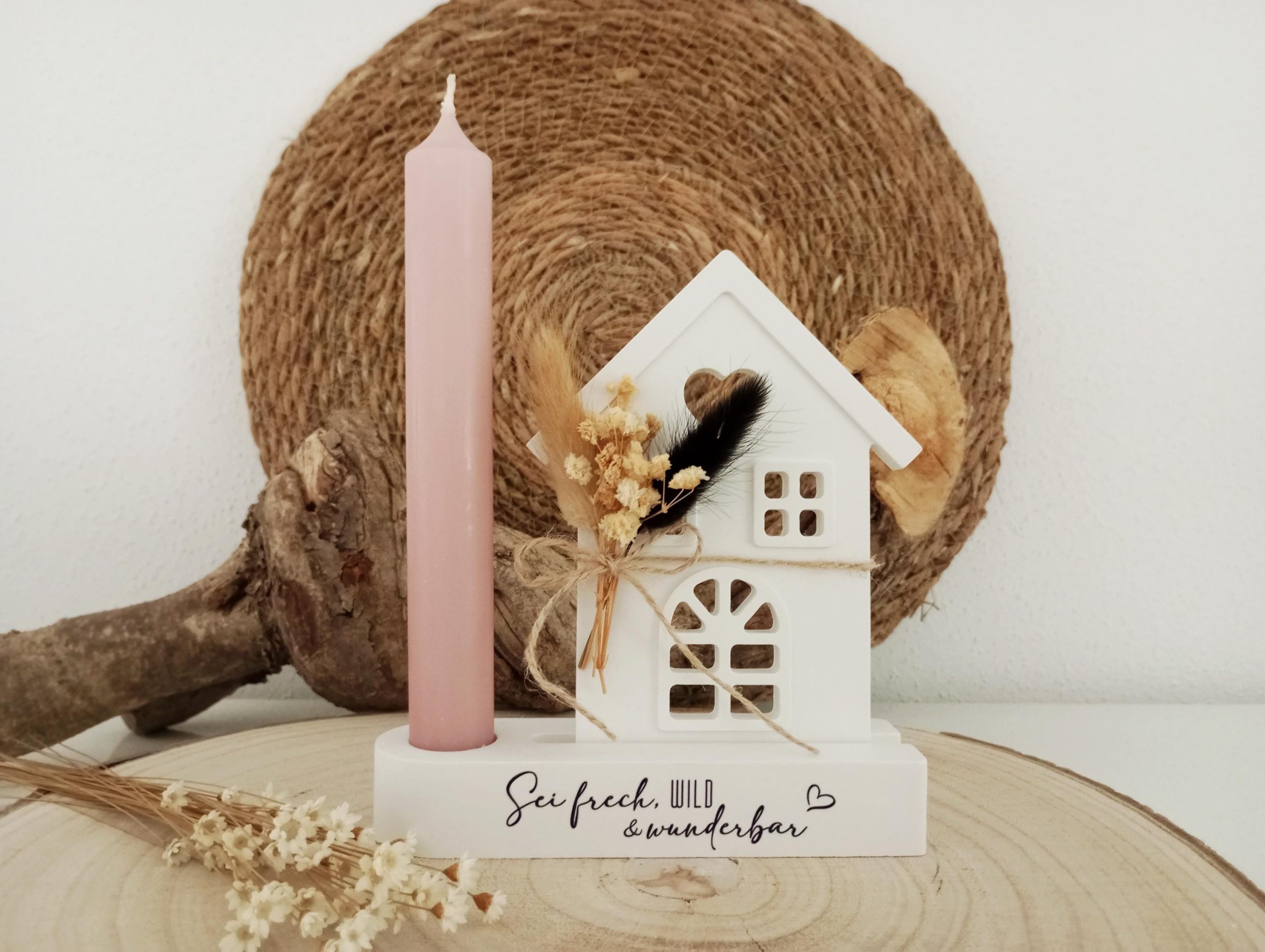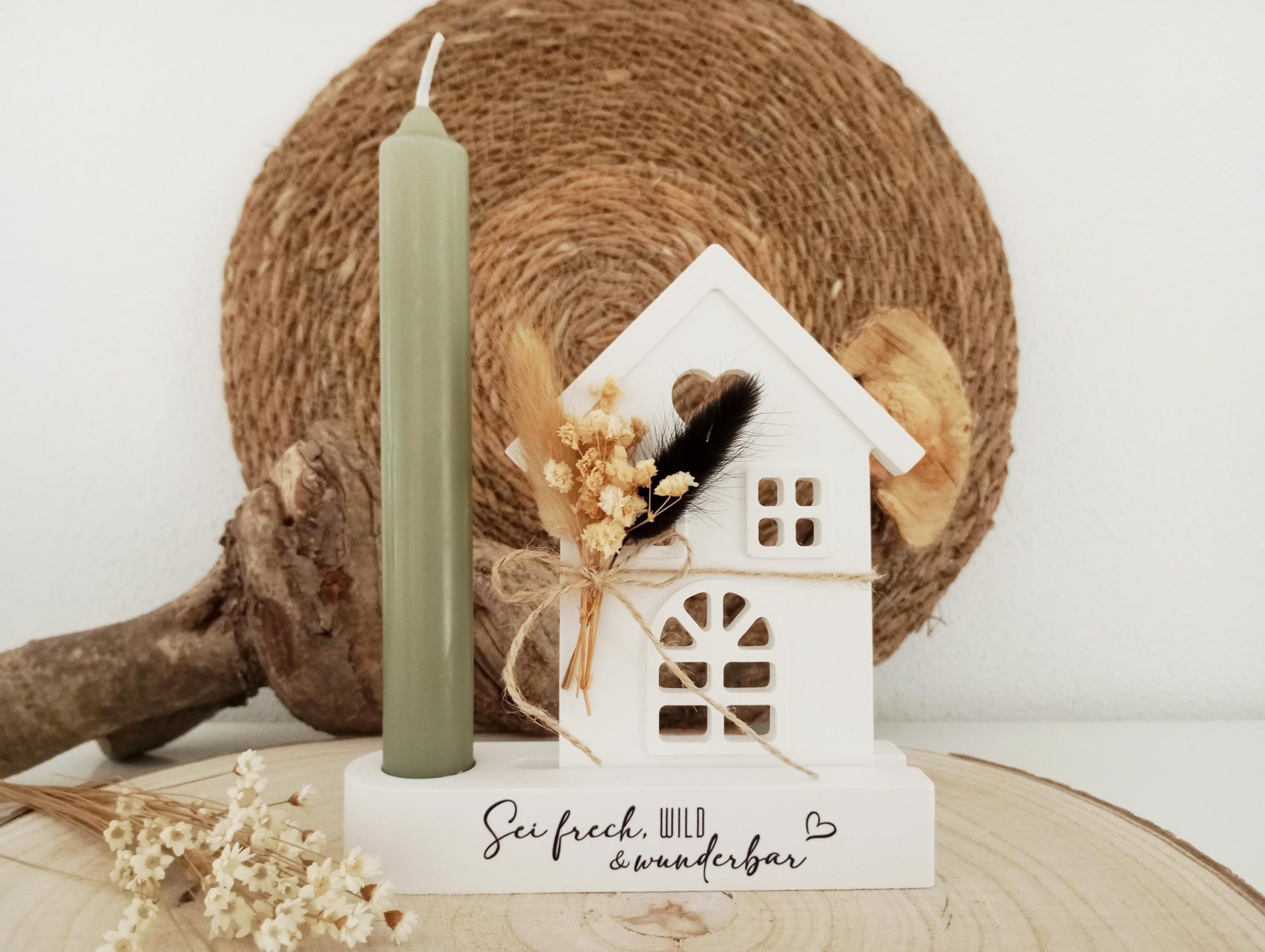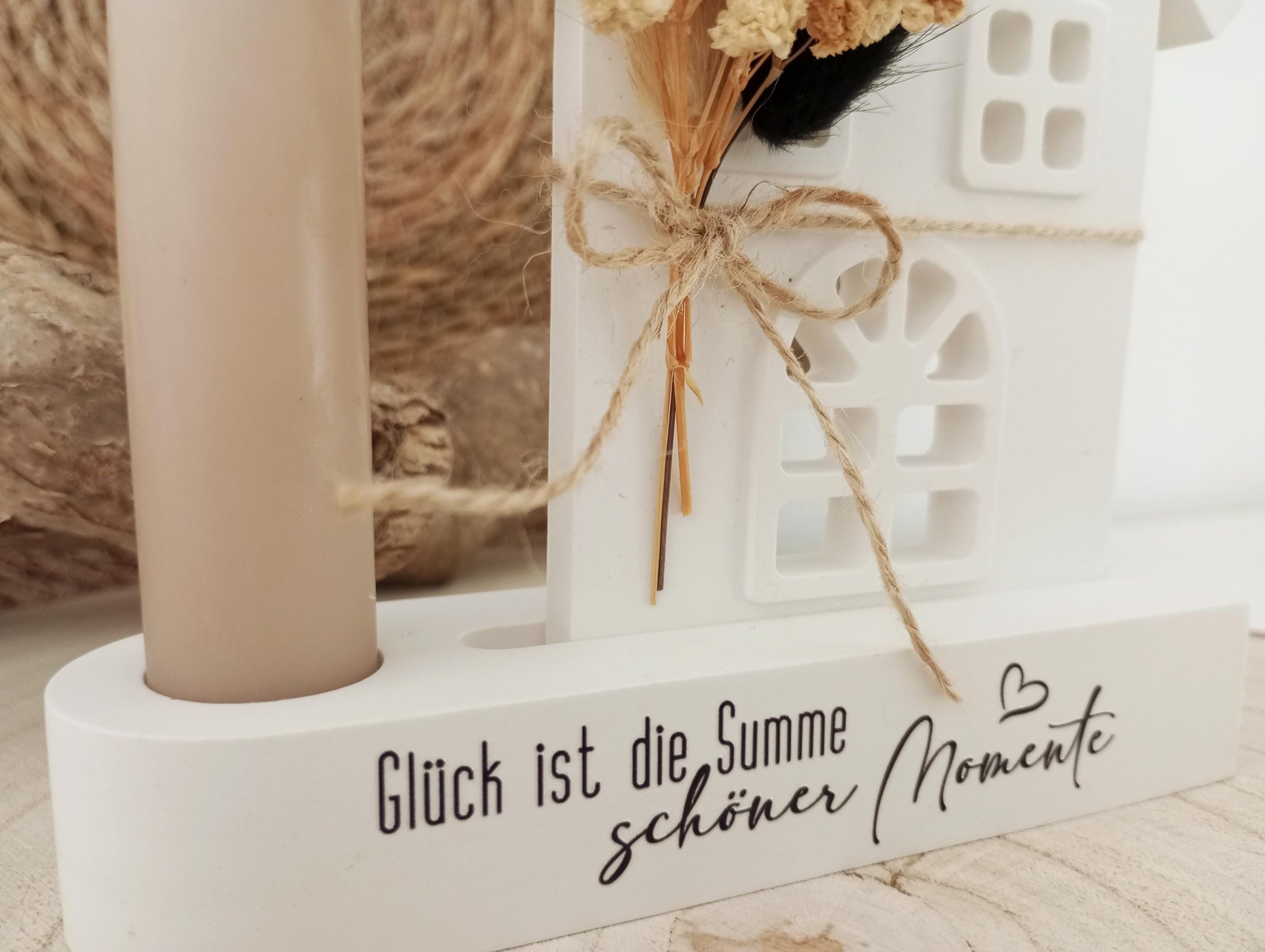 Handgefertigtes Haus mit Kerzenständer und liebevollem Spruch