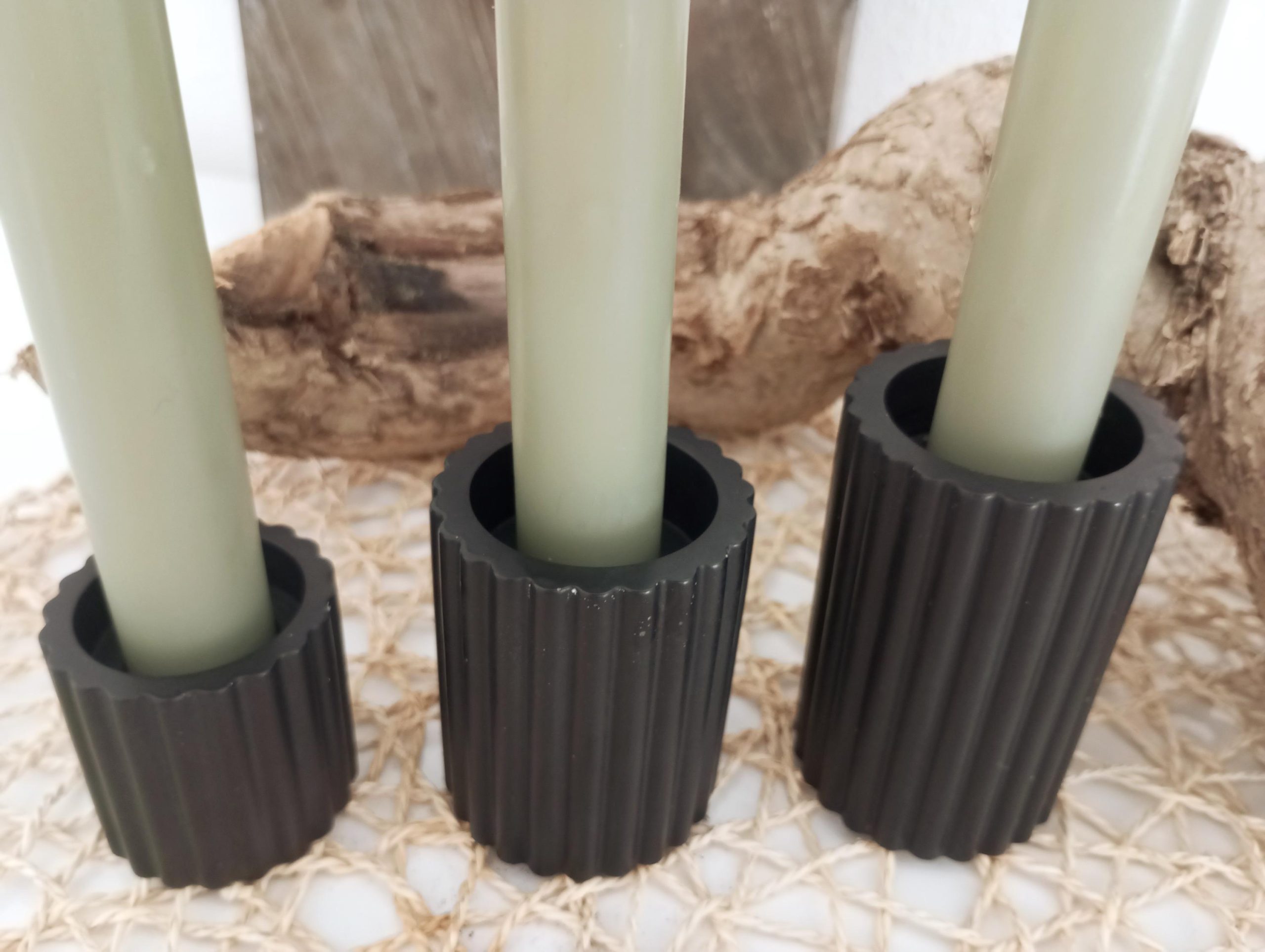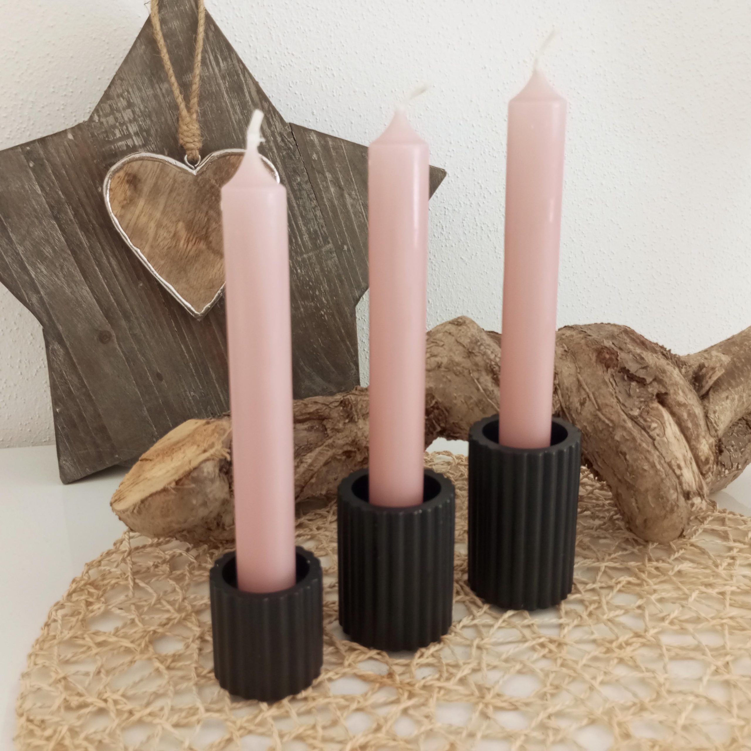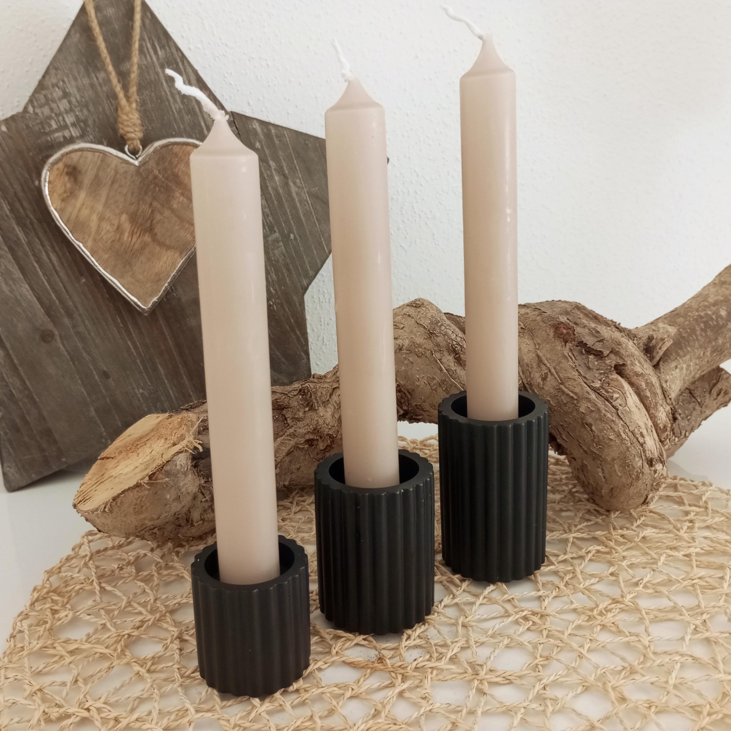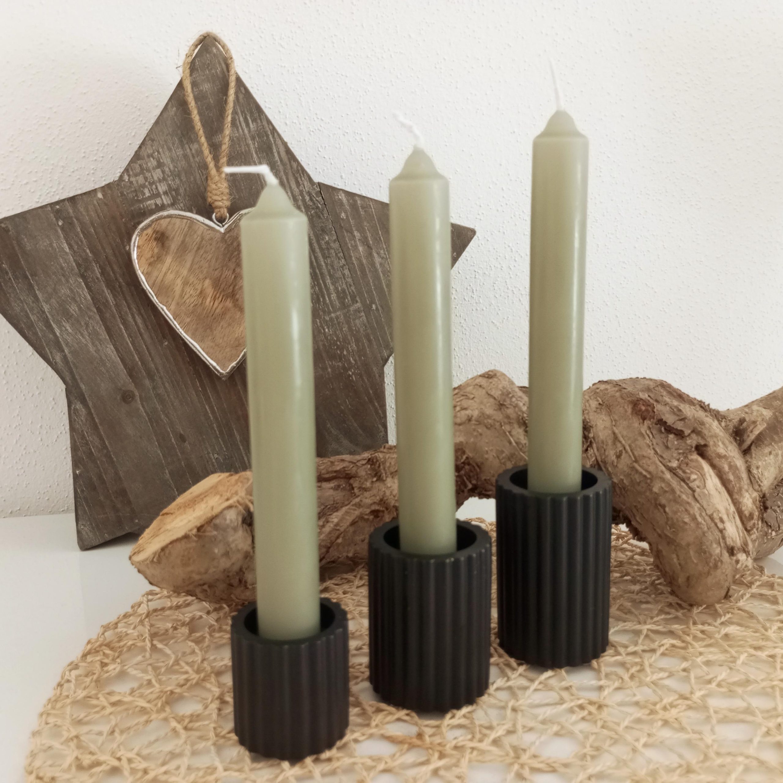 Erhältlich sind die Kerzenständer einzeln, als Set (klein+mittel+groß) oder als Set mit 3 Stück Kerzen. Dadurch kannst du die Dekoration flexibel gestalten und gleichzeitig ein stimmiges Arrangement schaffen.